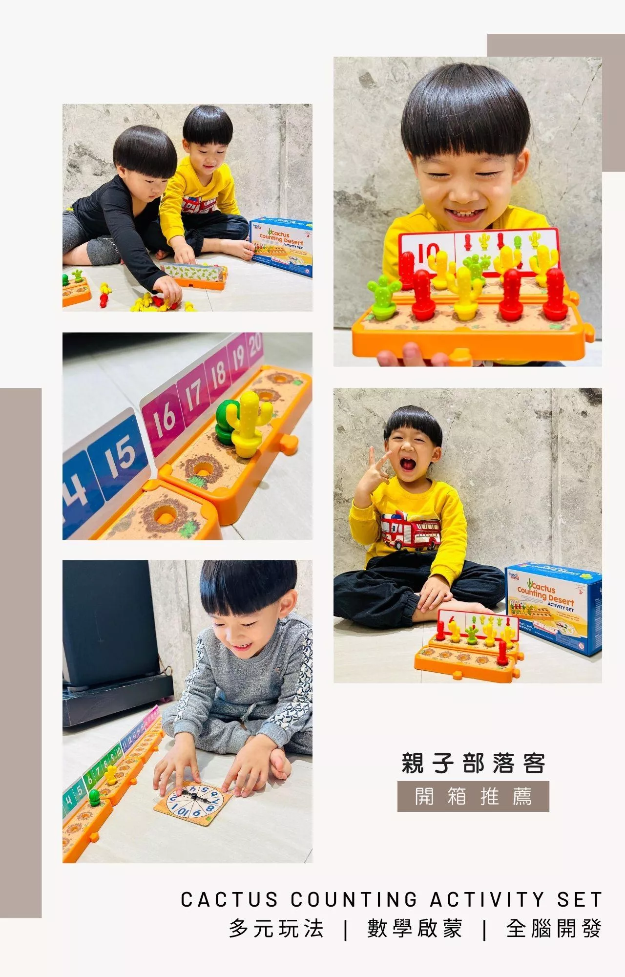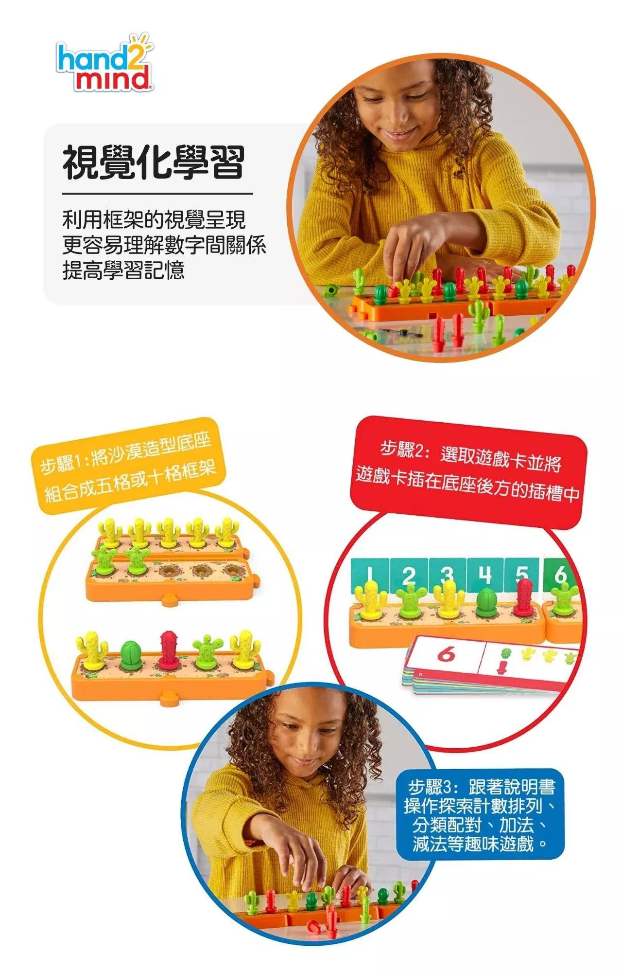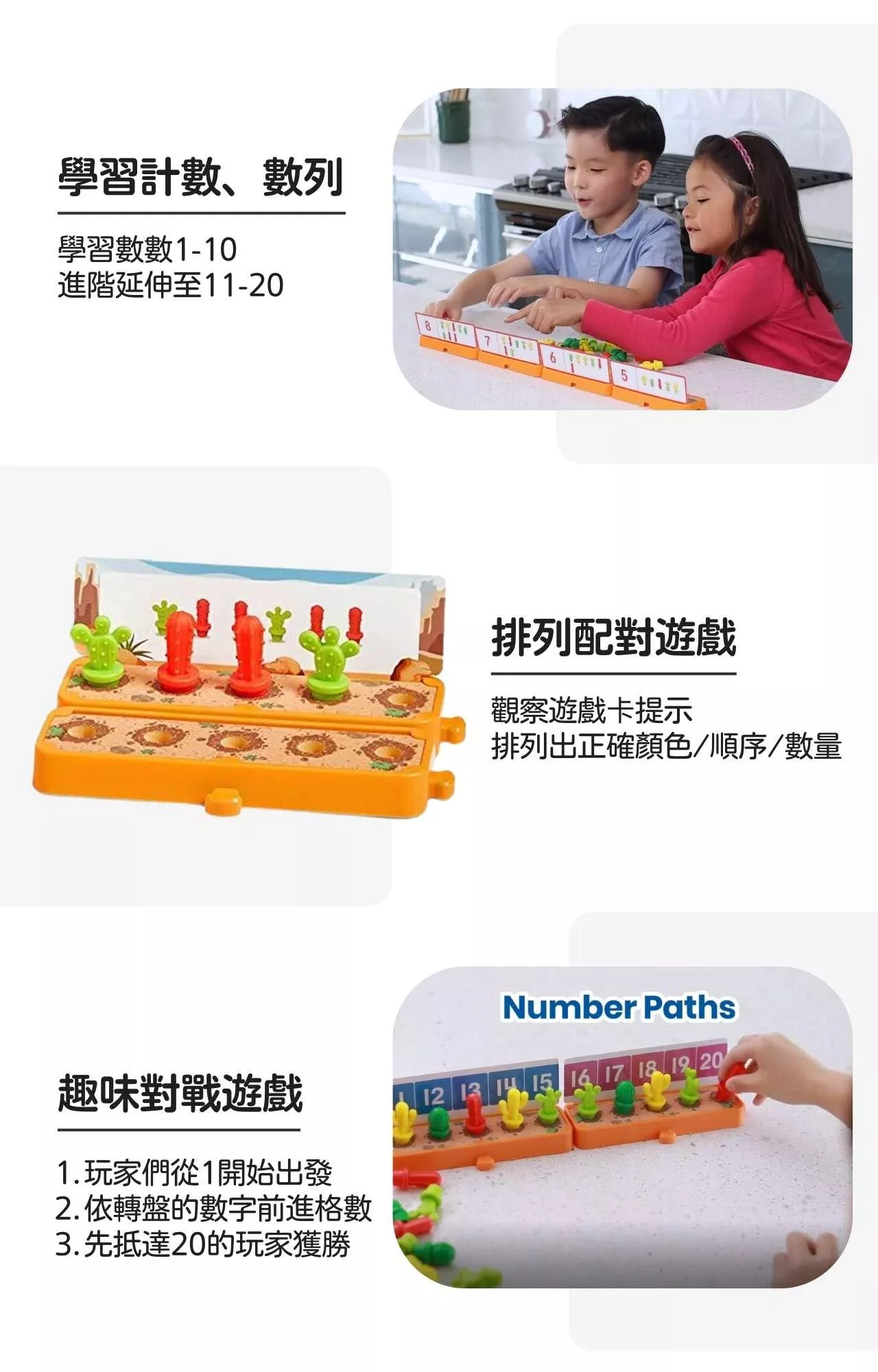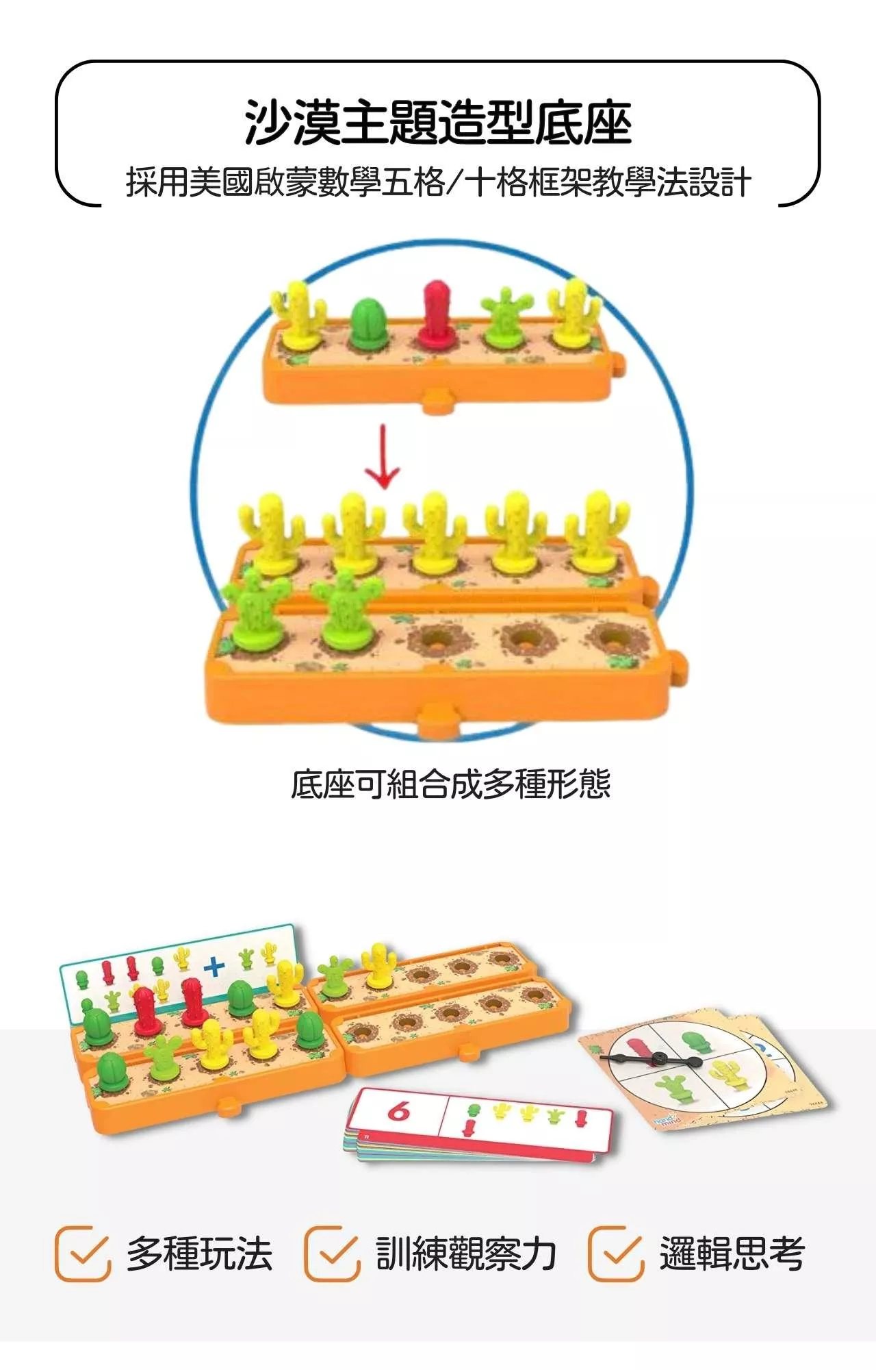 其中,沙漠場景遊戲底座採用歐美幼教老師常使用的五格框架,可依不同遊戲需求,相互組合成十格或二十格框架,幫助孩子在視覺上、操作遊戲時更容易理解數字間的關係,搭配遊戲卡上的圖案引導孩子進行計數、分類、配對、排列、數量比較、加減法等學習活動,增強學習記憶、輕鬆引導孩子們學習構建、比較和推理數字。