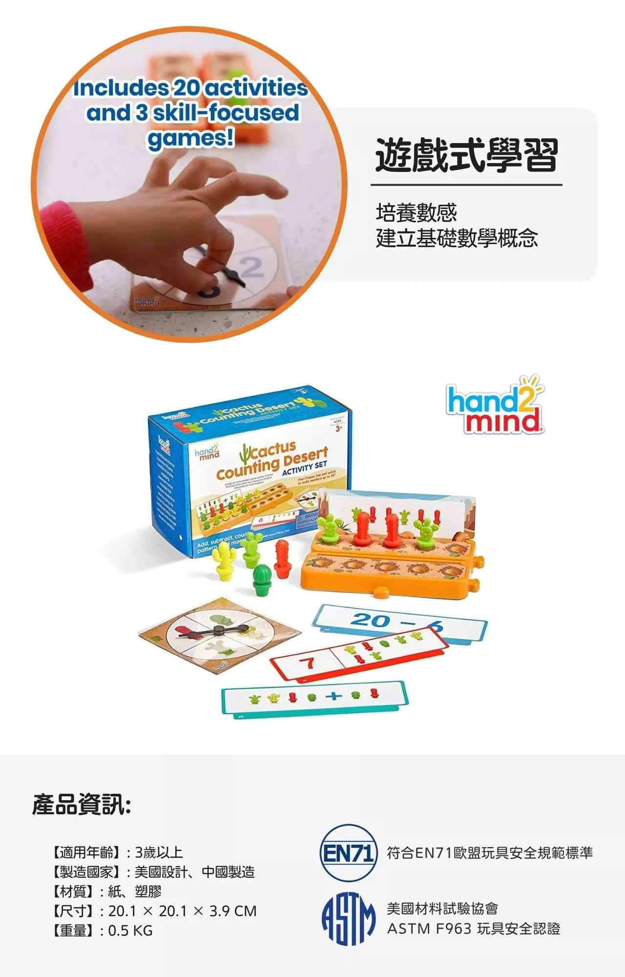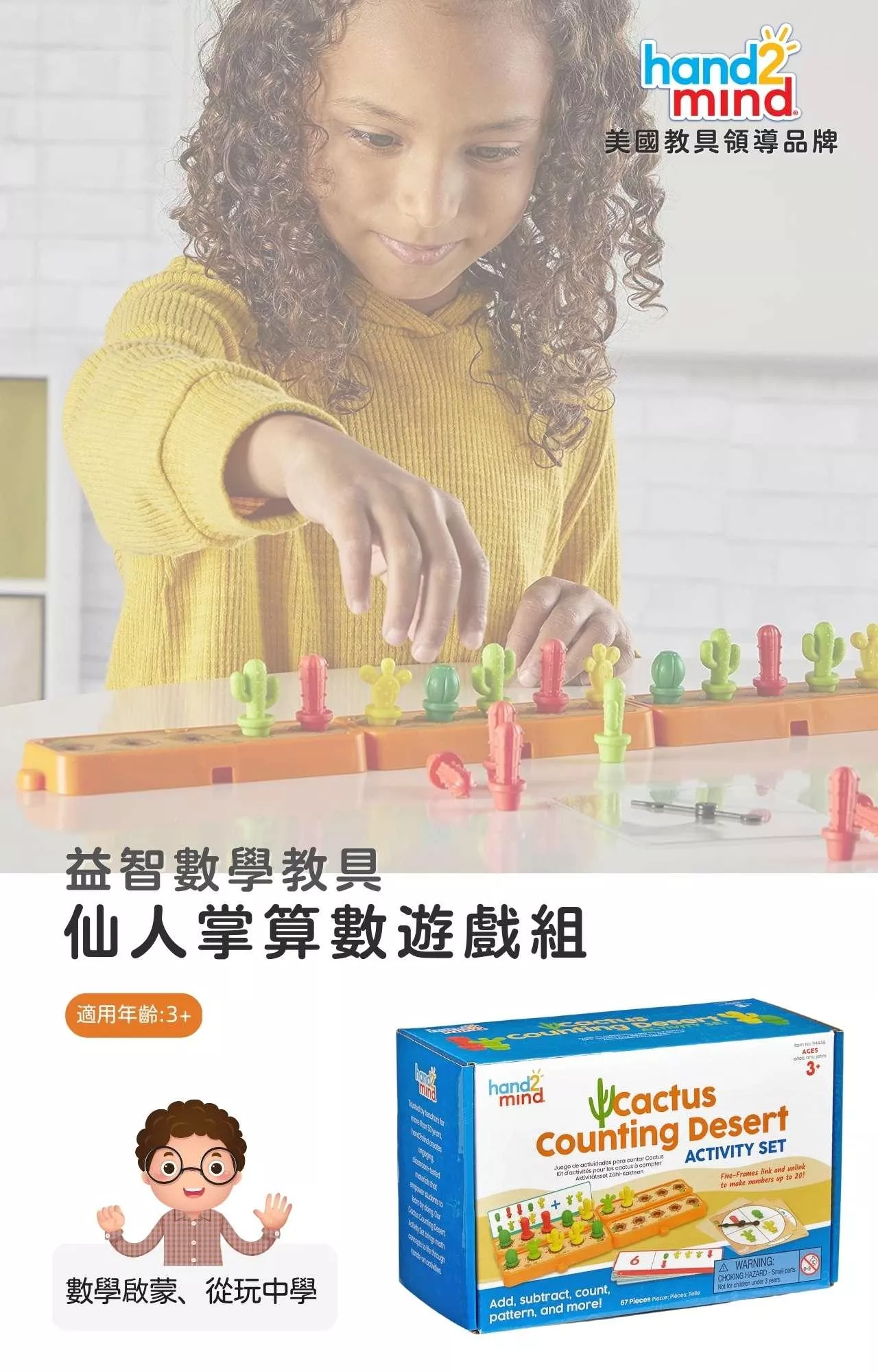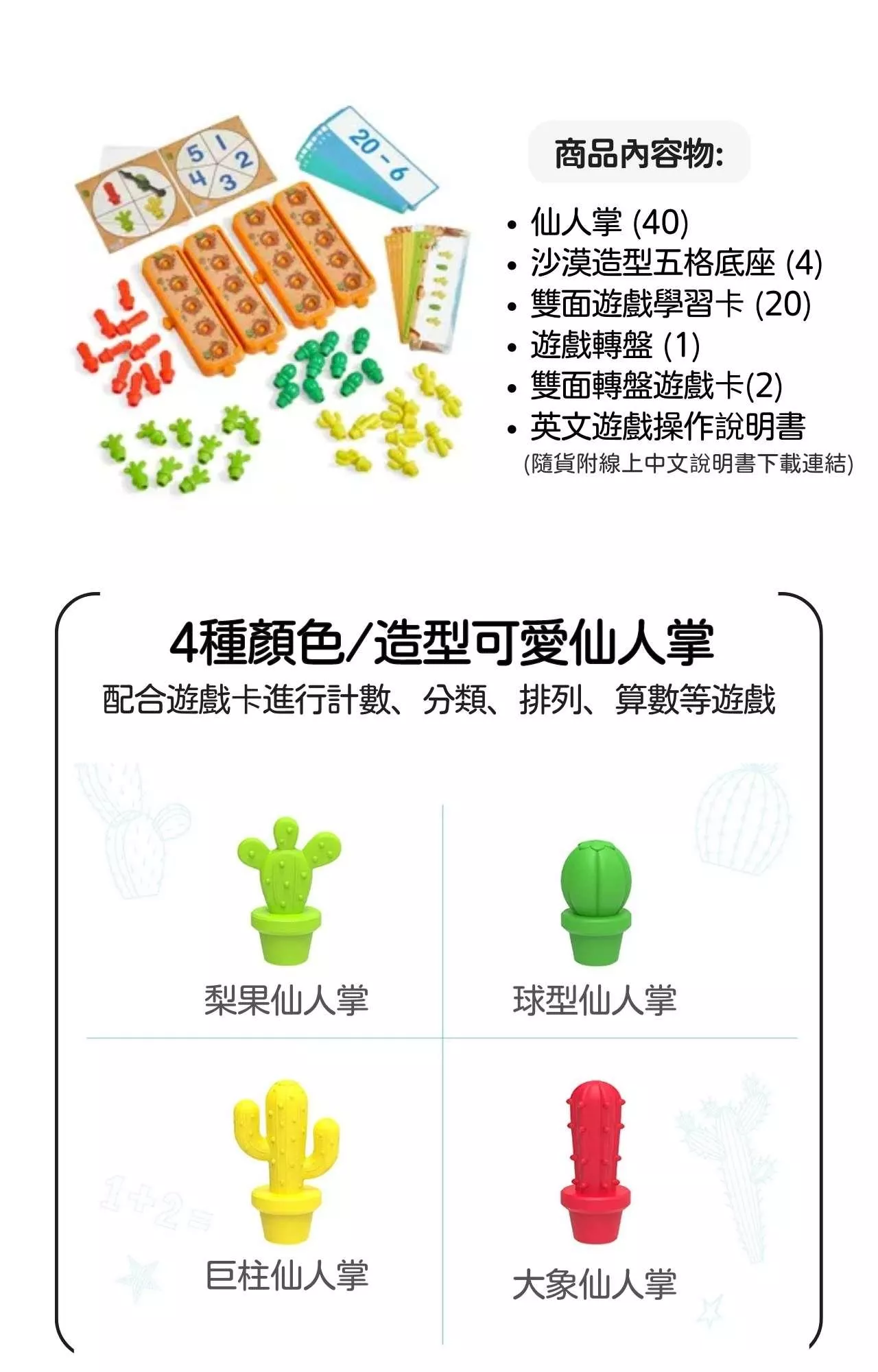 美國教具領導品牌hand2mind 益智數學教具-仙人掌算數遊戲組 Cactus Counting Desert Activity Set,透過遊戲式學習讓孩子們親手操作可愛的仙人掌模型來認識數學!遊戲組內含40個根據沙漠中獨特的景觀和色彩所設計的四種不同形狀的造型仙人掌、20張雙面設計遊戲卡、4個沙漠場景遊戲底座以及遊戲轉盤,可進行多種主題技能的學習遊戲以及互動遊戲。
