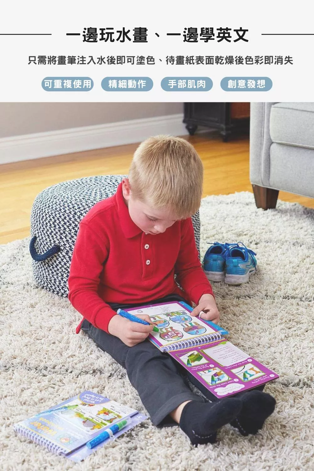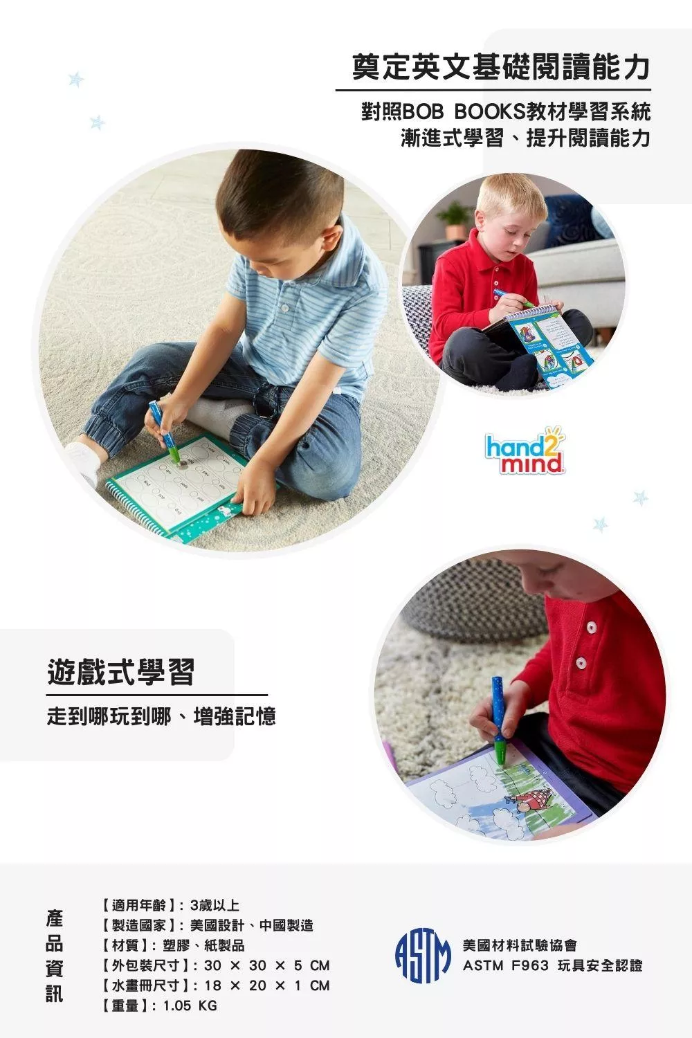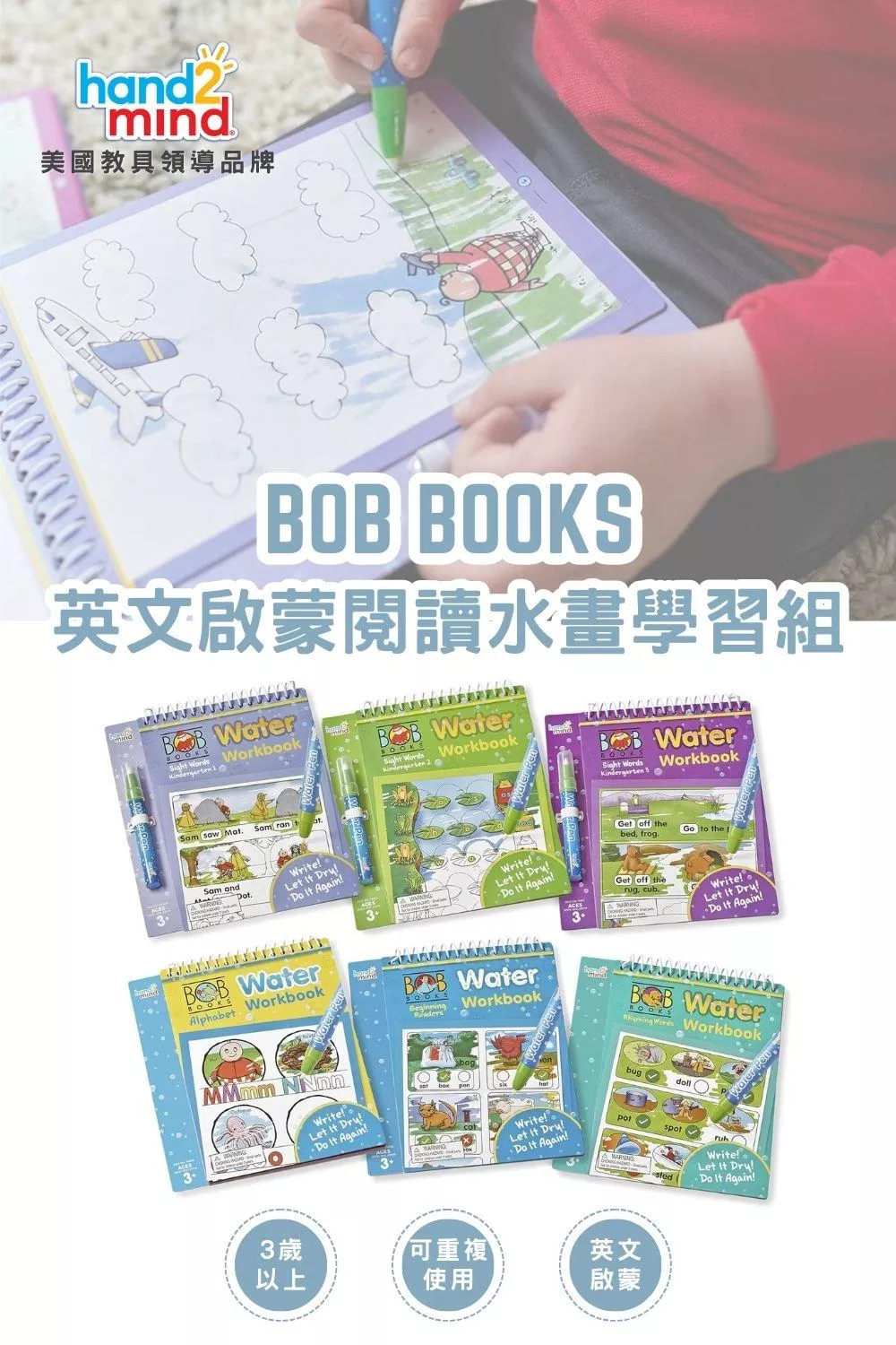 美國領導教具品牌hand2mind與BOB BOOKS聯名推出的Reading Readiness Water Workbook Set 英文啟蒙閱讀水畫學習組,由專業教師群設計的學習內容,讓孩子在學習基礎英文閱讀技能的同時,可重複使用柔軟的水畫筆填滿頁面的顏色,增添學習的樂趣。每本畫冊都有特殊可儲放畫筆的空間,不需擔心畫筆遺失,方便在家或外出攜帶使用,隨時隨地都能享受水畫上色的趣味。BOB BOOKS書中的經典角色在水畫冊裡都找得到哦!
