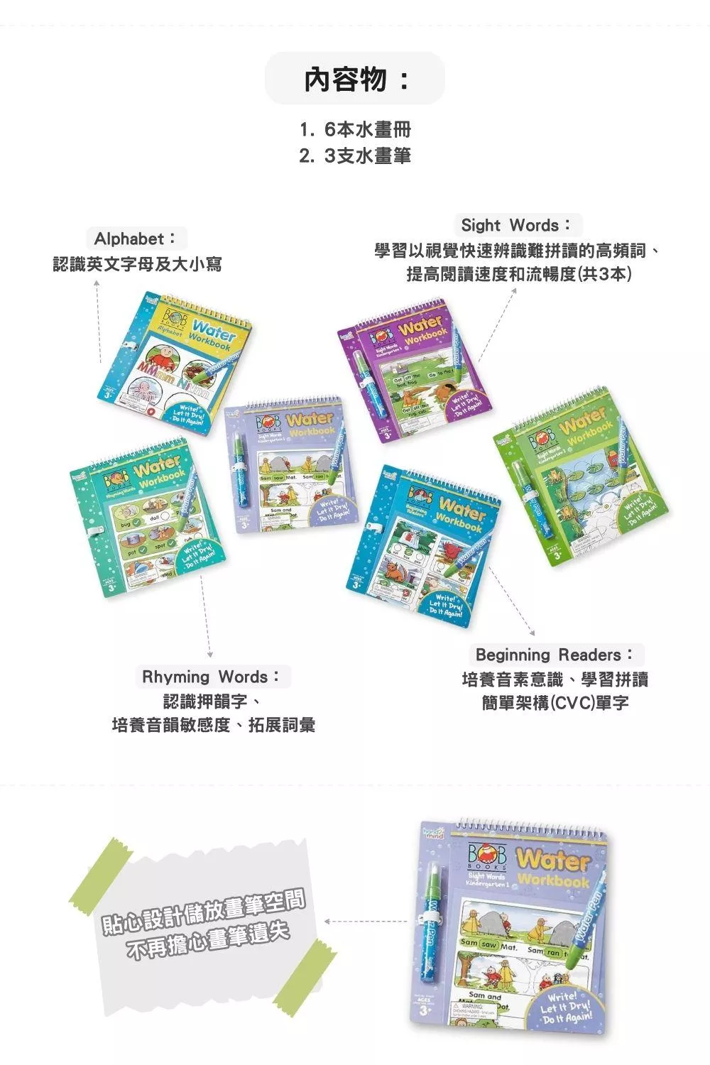 全套六本水畫冊對照了BOB BOOKS套書的階梯式學習系統,學習主題包括: