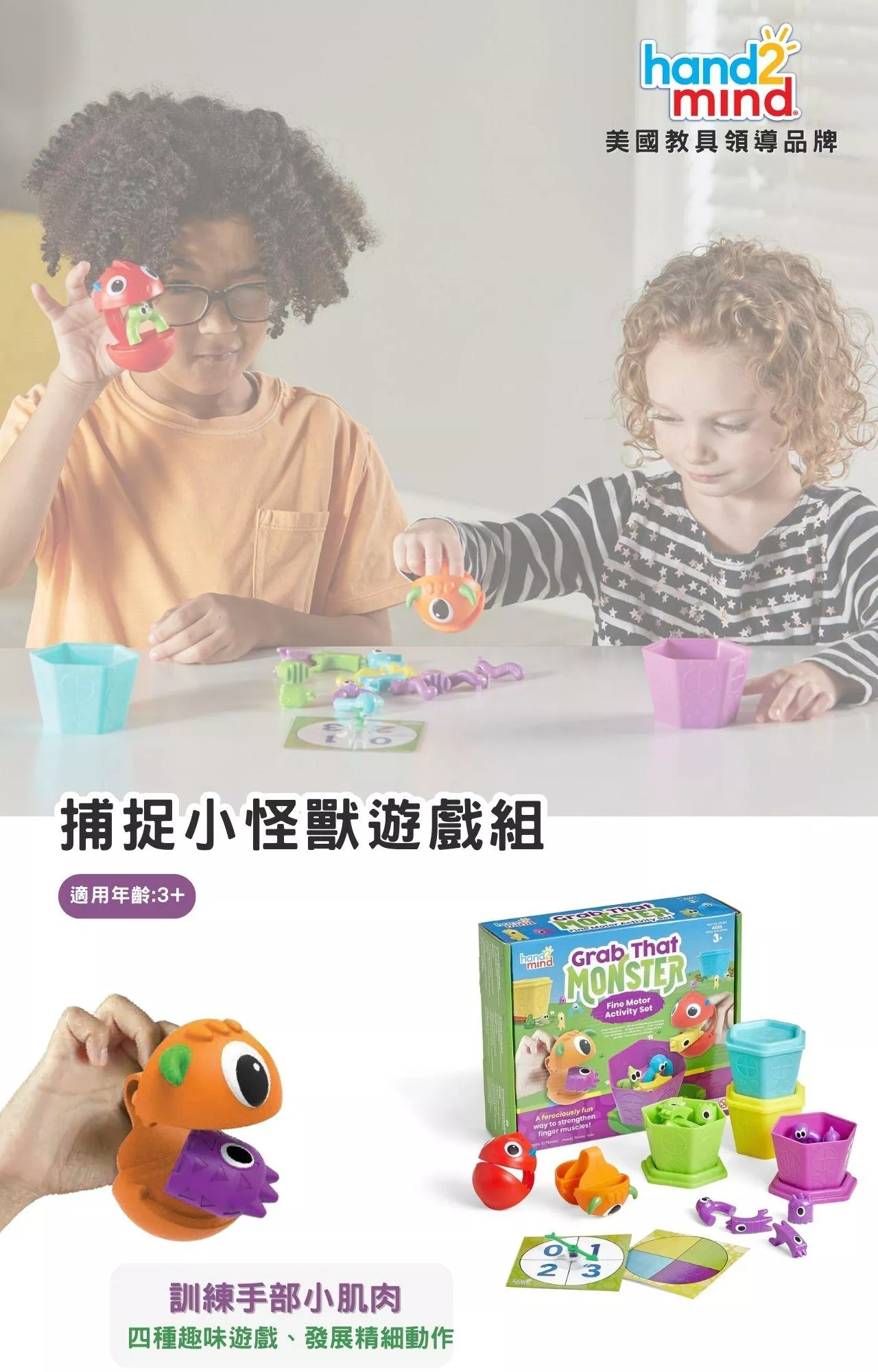美國教具領導品牌hand2mind 早教玩具-捕捉小怪獸遊戲組 Grab That Monster Fine Motor Skills Game,內含2個專為小小手設計的捕捉器以及其他55個遊戲配件,當孩子們使用手指開闔彩色的捕捉器來抓握可愛的小怪獸時,能夠強化孩子們的手指肌肉、增進手部精細動作發展,為未來開始進行書寫、綁鞋帶、拉拉鍊等其他活動做好準備。