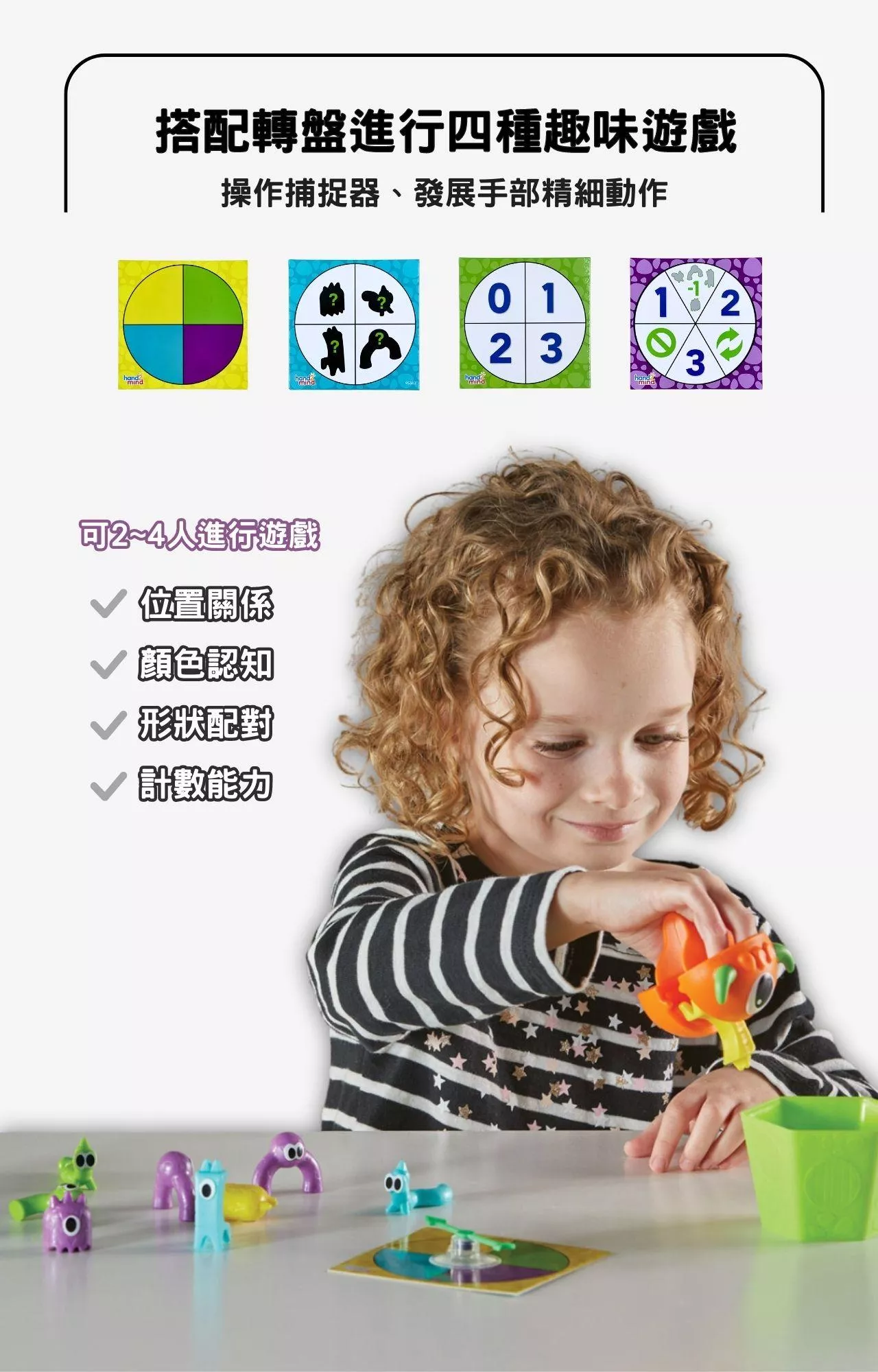 搭配遊戲組內2個雙面遊戲轉盤卡,可進行多種趣味遊戲,促進孩子學習顏色配對、形狀辨識分類、進行角色扮演遊戲、以及學習形容物體位置的介係詞等等,可2-4人同時進行遊戲,不管是在家自學或是在學校教室,皆能提供多種遊戲和學習的模式。