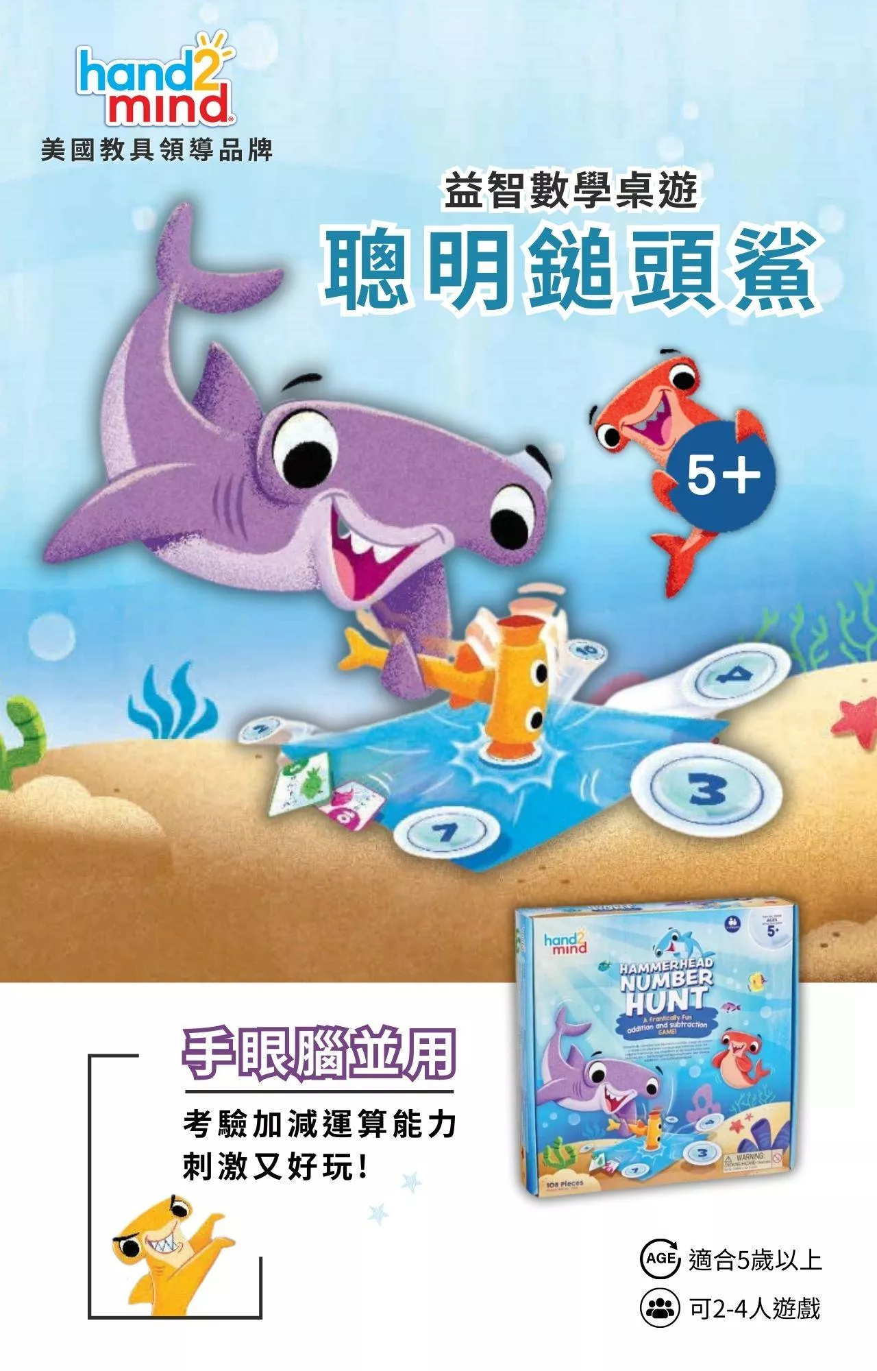 美國教具領導品牌hand2mind《聰明鎚頭鯊 Hammerhead Number Hunt》是一款趣味的益智數學桌遊,讓玩家們在快節奏的遊戲中,使用特殊設計的鯊魚鎚子獲取數字卡來完成基本的加減運算,進行2-4人、手眼腦並用的趣味競賽,考驗小玩家們的反應力以及手眼協調能力。
