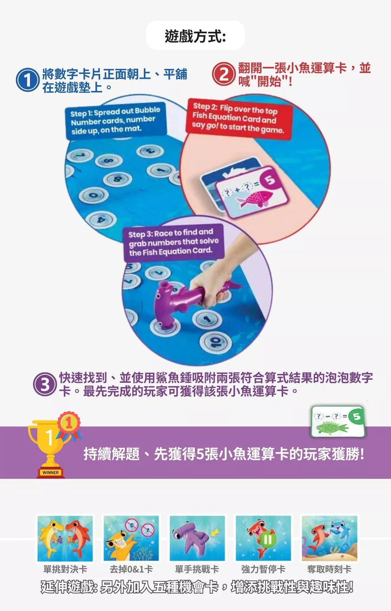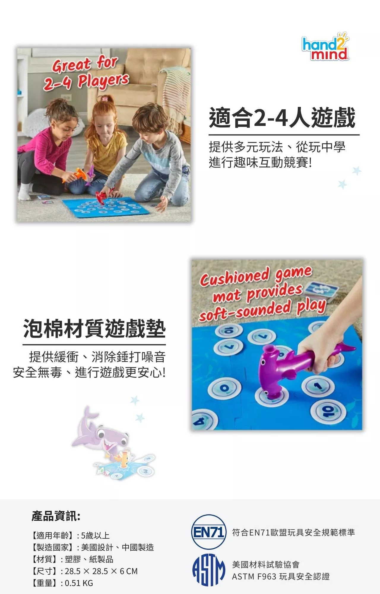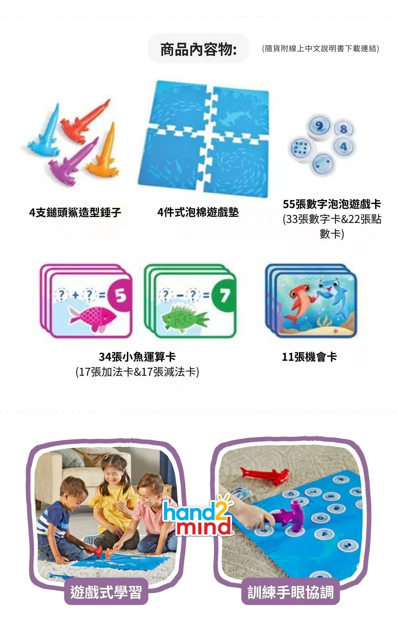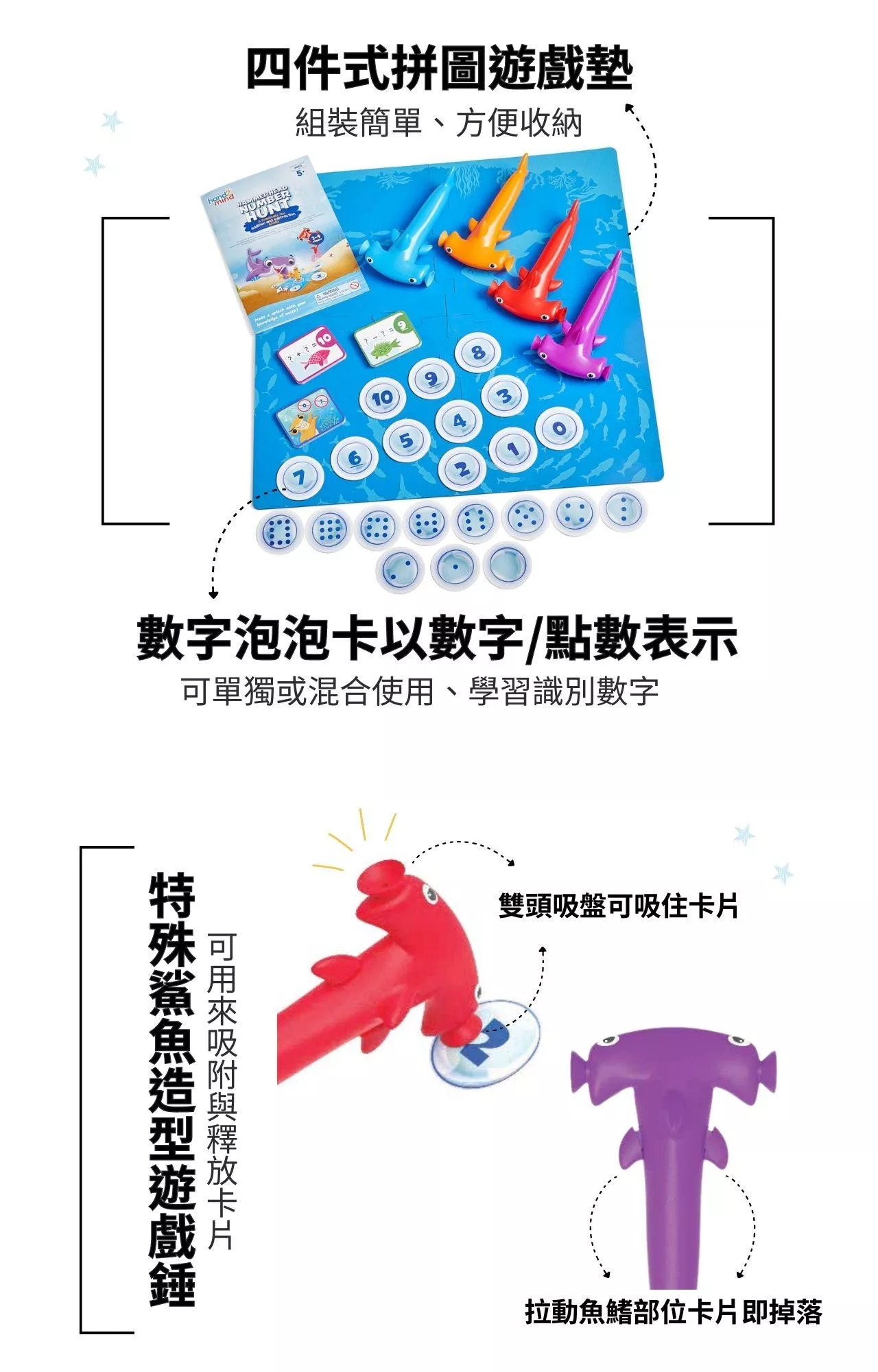 鎚頭鯊造型的雙頭鎚子兩端都有吸盤,可以用來快速吸附與抓取卡片;特殊設計的鯊魚鰭片按鈕則是用來釋放卡片。操作鯊魚鎚的手部動作能幫助孩子們增強手指肌肉的運用和精細動作技能。拼圖式遊戲墊組裝簡單、方便收納,採用泡棉材質能有效吸收敲擊聲,安全無毒,除了作為數學教具,也是一款非常適合全家人同樂的益智家庭桌遊。