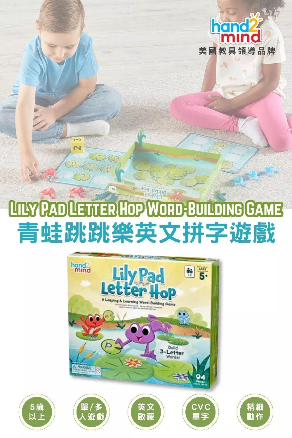 美國教具領導品牌hand2mind 益智英文教具-青蛙跳跳樂英文拼字遊戲 Lily Pad Letter Hop Word-Building Game,遊戲中孩子們將透過超好玩的彈射青蛙方式,將手上的青蛙發射到字母池塘中以收集荷葉字母卡牌,並利用字母卡牌嘗試在自己的拼字遊戲墊上拼出CVC(子音-母音-子音)單詞來贏得遊戲勝利。
