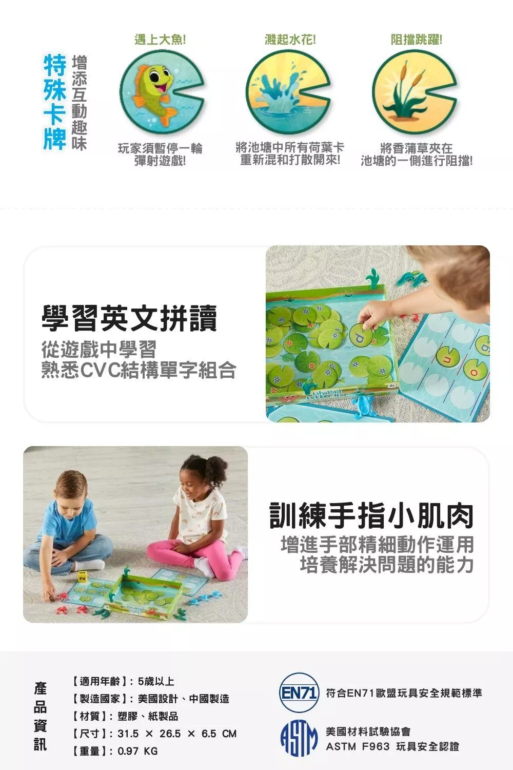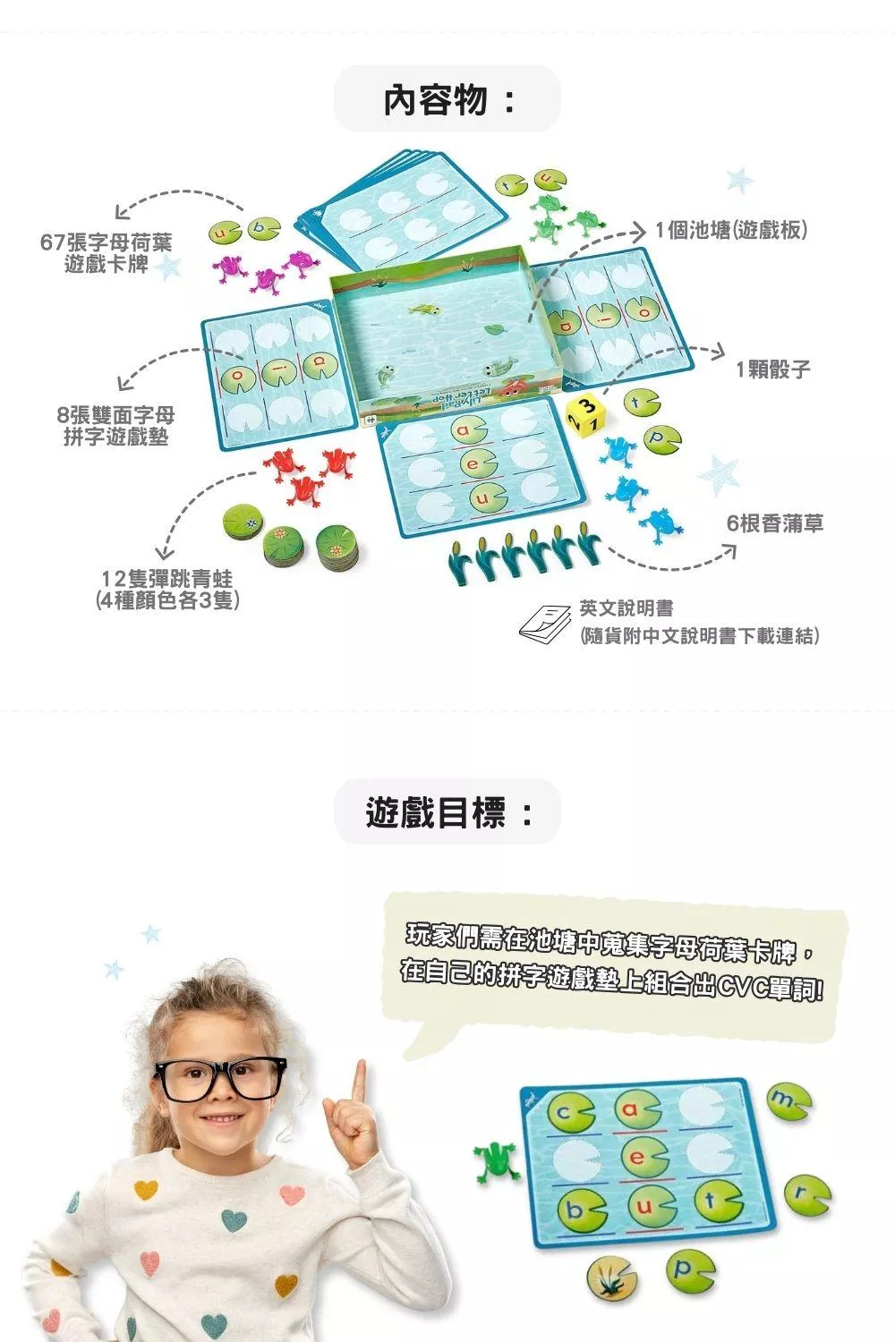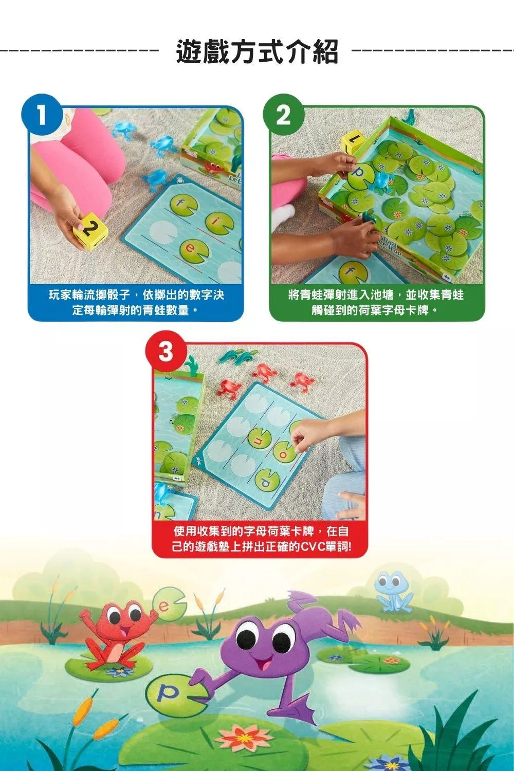 ● 透過節奏明快的「青蛙跳跳樂」英文拼字遊戲,讓孩子輕鬆掌握學齡前的英文拼讀技巧!