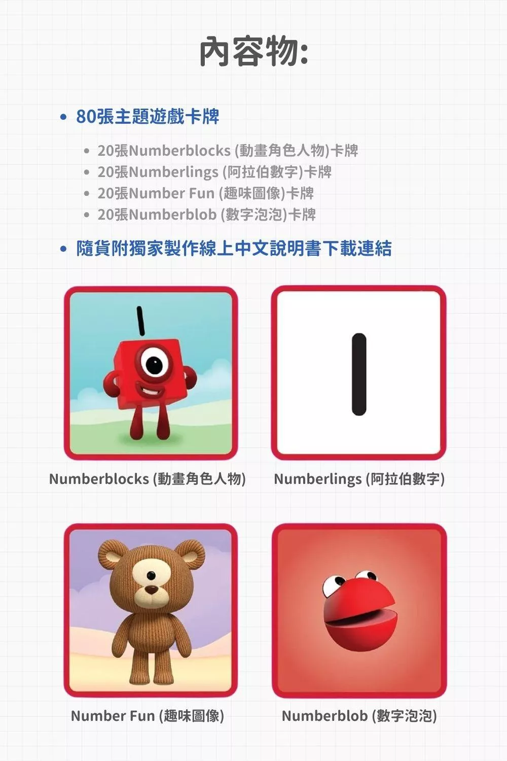 這款遊戲的核心玩法源自經典的記憶翻牌遊戲,但在此基礎上增加了更多變化與挑戰。遊戲組包含80張遊戲卡牌,分成4種類型: Numberblocks(動畫角色人物)卡牌、Numberlings(阿拉伯數字)卡牌、Number Fun(趣味圖像)卡牌、Numberblob(數字泡泡)卡牌,孩子可以透過不同類型的配對方式,加深對數字的認識以及學習不同的數字表示方式,提升邏輯思考能力。