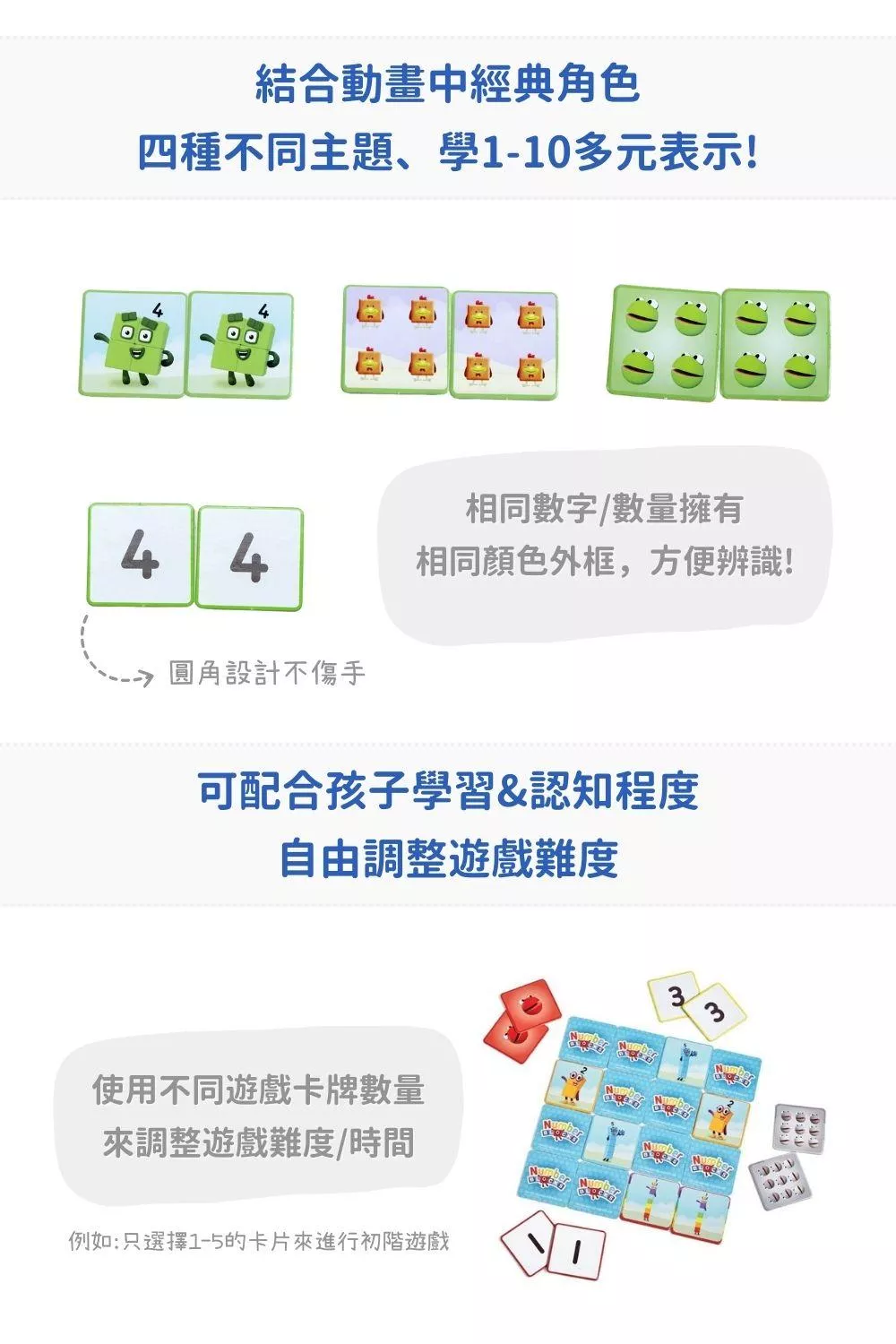 不同於傳統記憶翻牌遊戲,這款遊戲提供四種不同的配對組合,使孩子不僅能練習基本數字配對,學習數字/數量的多元表示方式,提升觀察力與邏輯思維。相同數字/數量的遊戲卡牌採用相同顏色外框作為提示,讓孩子們更容易辨識。