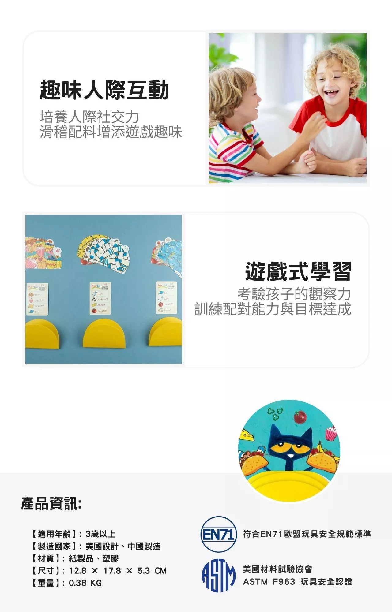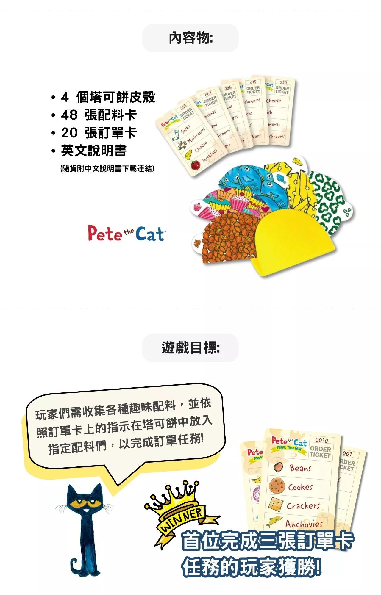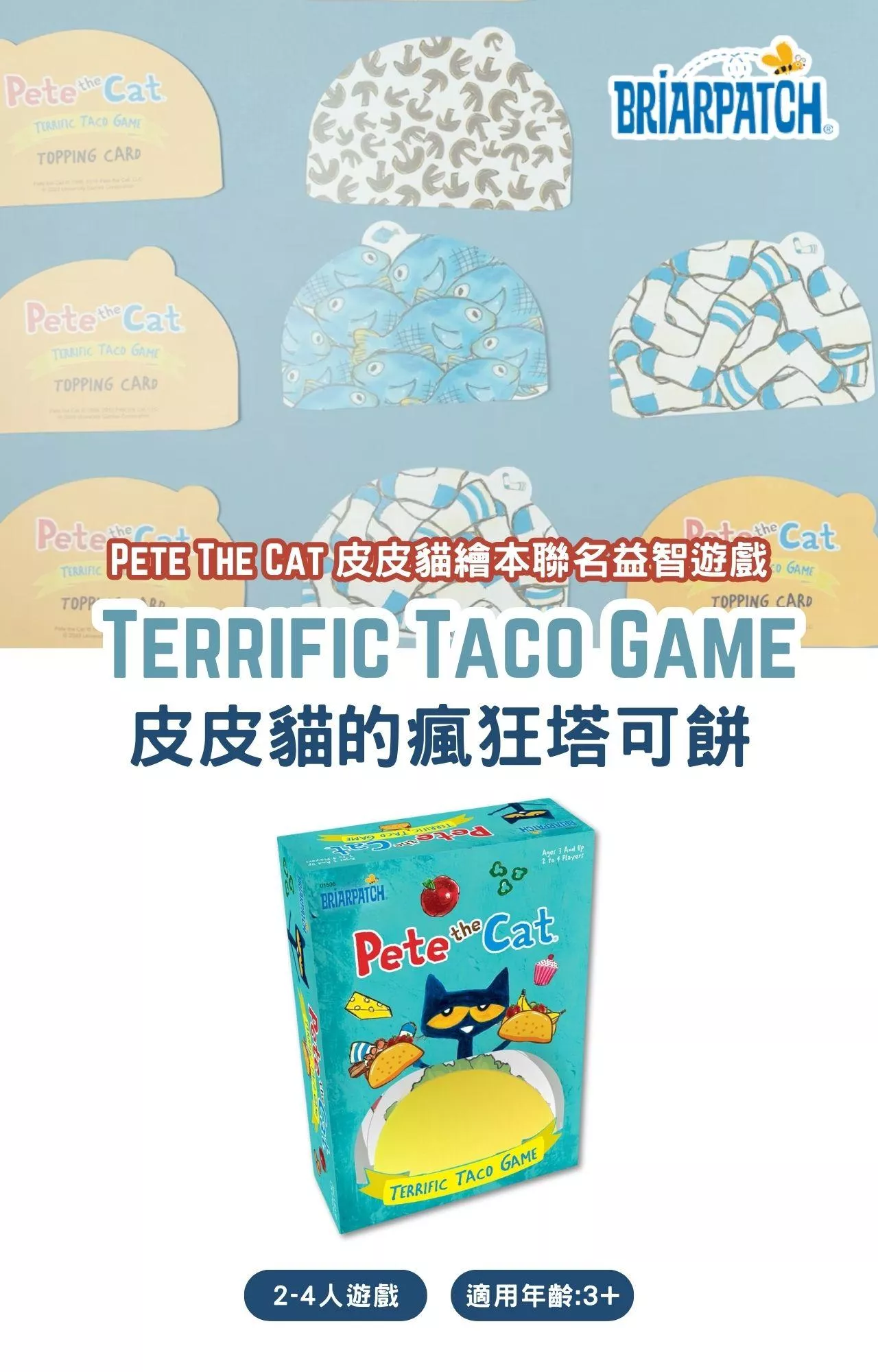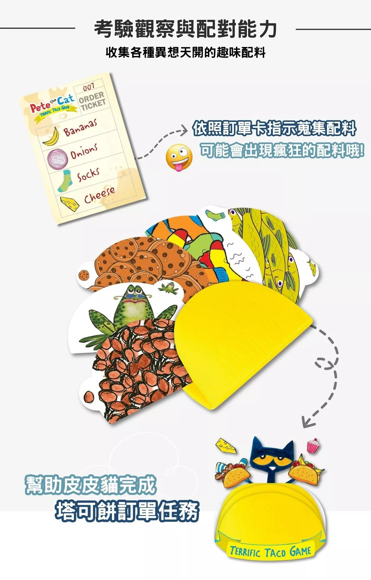 美國知名學習遊戲品牌Briarpatch與美國人氣熱銷的情緒主題繪本皮皮貓Pete the Cat授權聯名推出的益智桌遊-皮皮貓的瘋狂塔可餅 Pete the Cat Terrific Taco Game,適合3歲以上大朋友小朋友,一起在遊戲過程中依照訂單卡上的指示收集指定的配料,放入塔可餅皮中以完成訂單任務。遊戲方式簡單易懂,多種異想天開的趣味配料例如襪子等等更是增添了遊戲的趣味性。