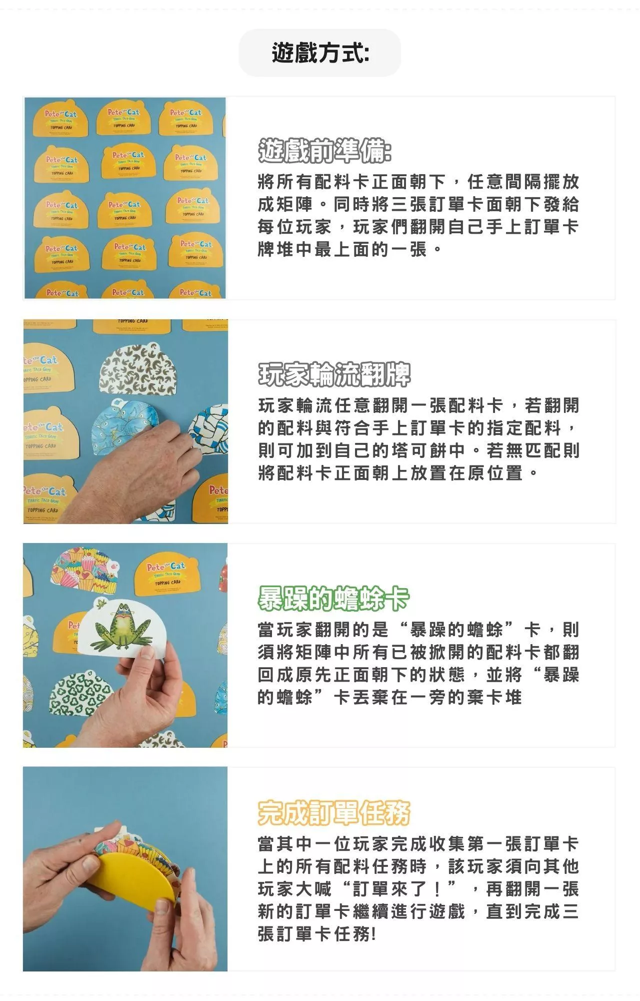 皮皮貓的瘋狂塔可餅 遊戲方式非常簡單,玩家輪流翻開桌上的配料卡,依照自己手上訂單卡上的配料項目,收集指定的配料以完成訂單任務,最先完成三張訂單卡任務的玩家獲勝!除了訓練孩子們的觀察力與配對能力,也能培養孩子的目標達成能力,同時透過遊戲中與其他玩家互動增進孩子的人際社交力。