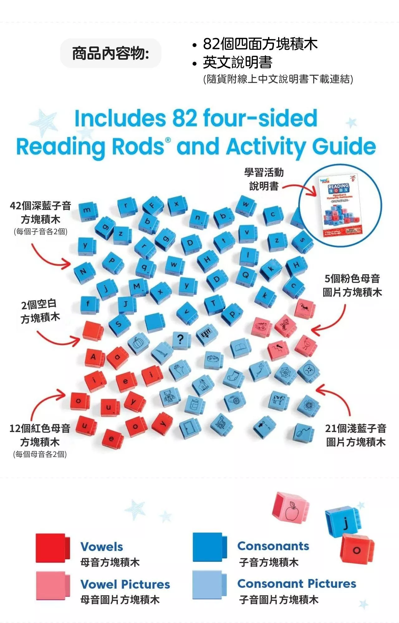 Alphabet & Phonemic Awareness 英文字母&音素意識學習組,內含82顆方塊積木,包括英文字母與圖片、子音與母音等,搭配說明書引導教學活動,讓孩子透過親手操作連結積木、組合拆解,學習識別字母、認識音韻音聲、音節拆解(首音/中間音/尾音)、創建同韻字以及建構CVC單詞等基礎識字閱讀技能。