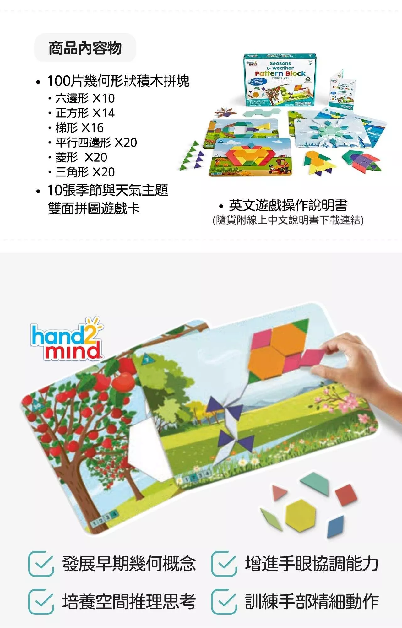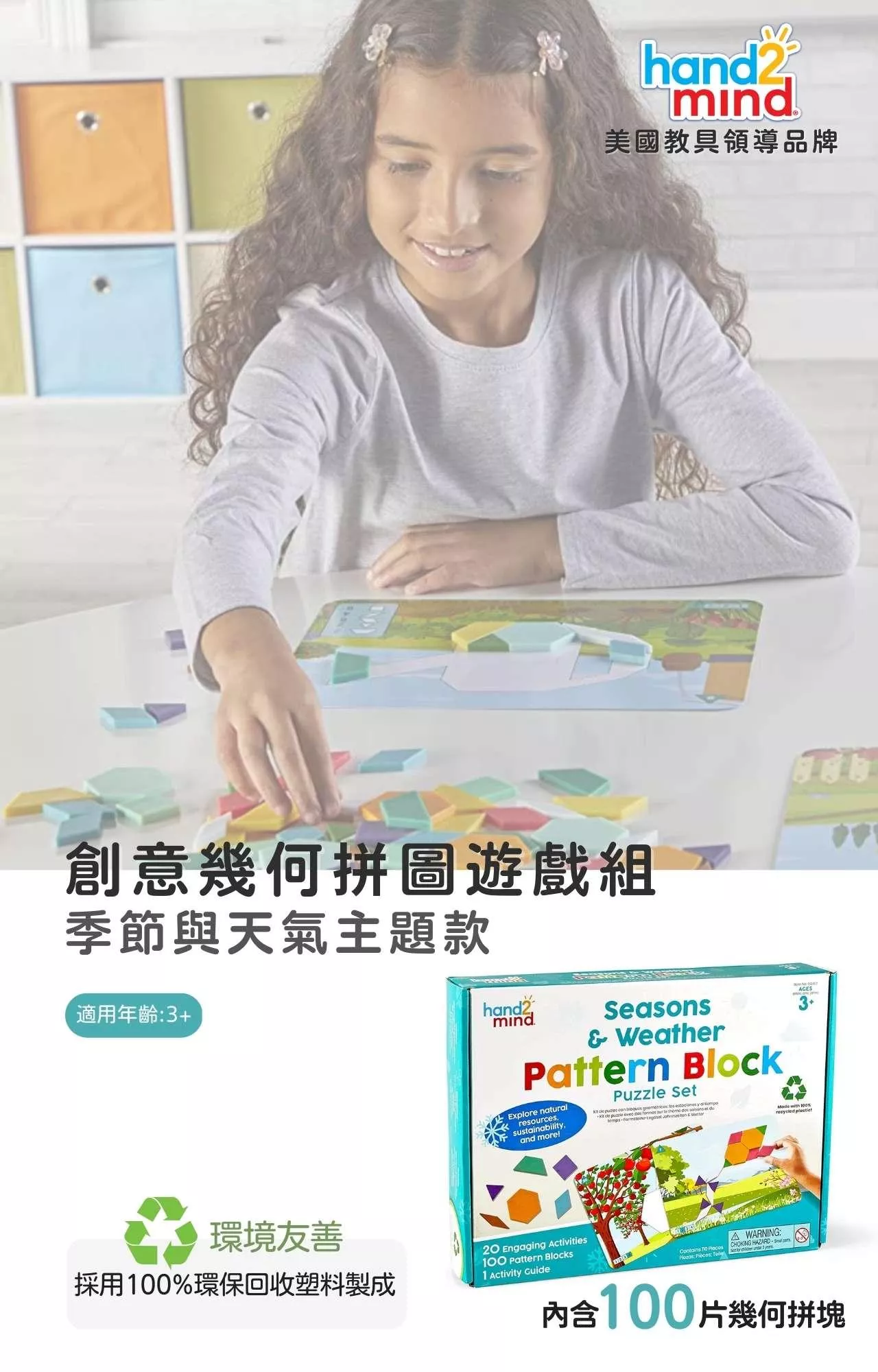 美國教具領導品牌hand2mind創意幾何拼圖遊戲組-季節與天氣主題款,內含100片採用100%回收塑料所製成的積木拼塊,以及10張雙面設計的主題遊戲圖卡,可進行20個趣味拼圖遊戲,幫助孩子們了解永續發展主題、季節和天氣之間關係。