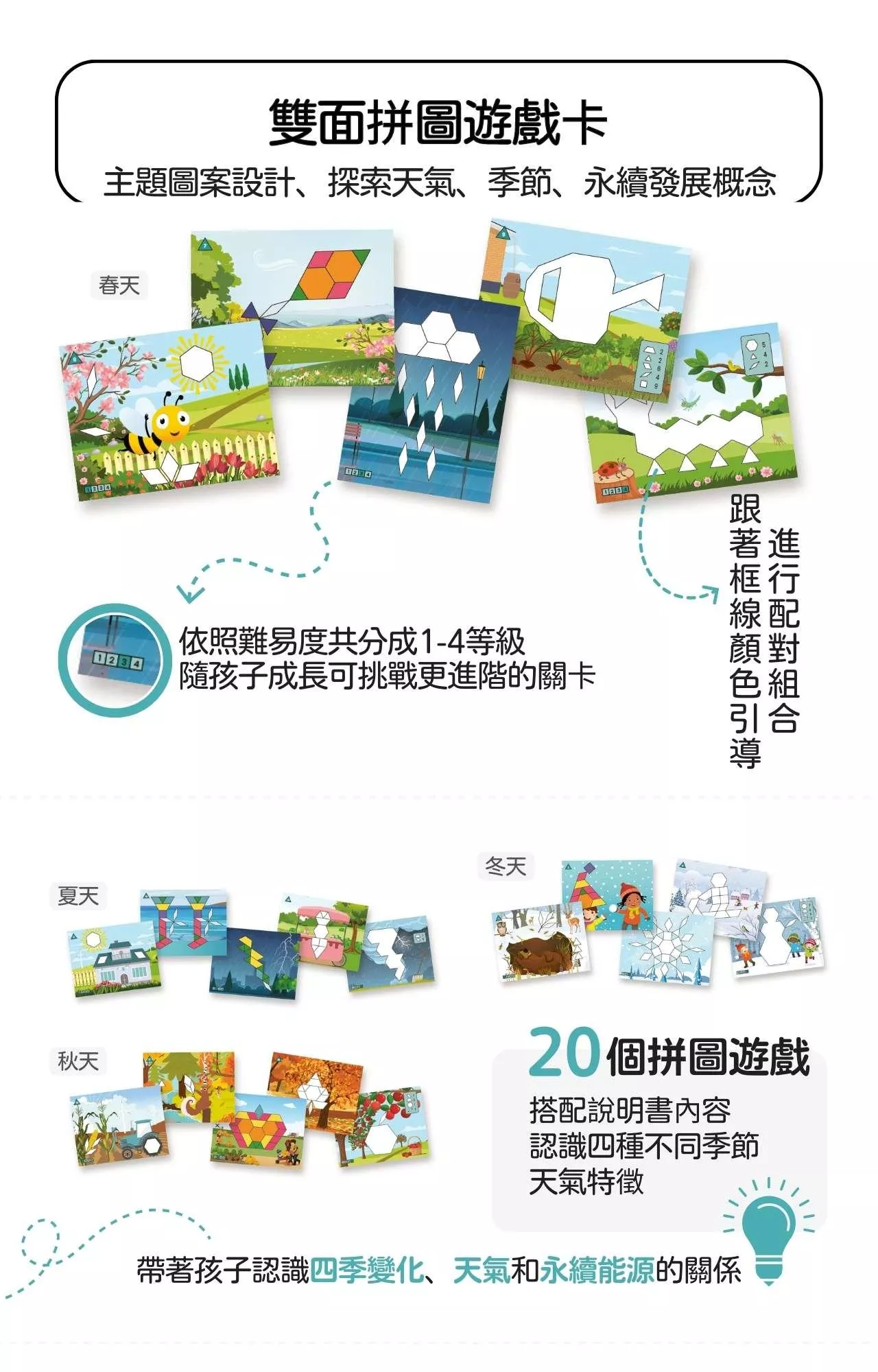 透過本遊戲組中的十張雙面主題遊戲卡片,孩子們能夠學習如何仔細觀察生活中的自然環境,認識四個不同季節中的天氣特徵,從而更深入地了解如何利用綠色可再生能源、落實地球環境保育。透過遊戲卡上框線與圖案引導,讓孩子們親手操作組合各種形狀的幾何積木拼塊,促進發展早期的幾何數學概念、手部精細動作技能以及空間推理思考能力。