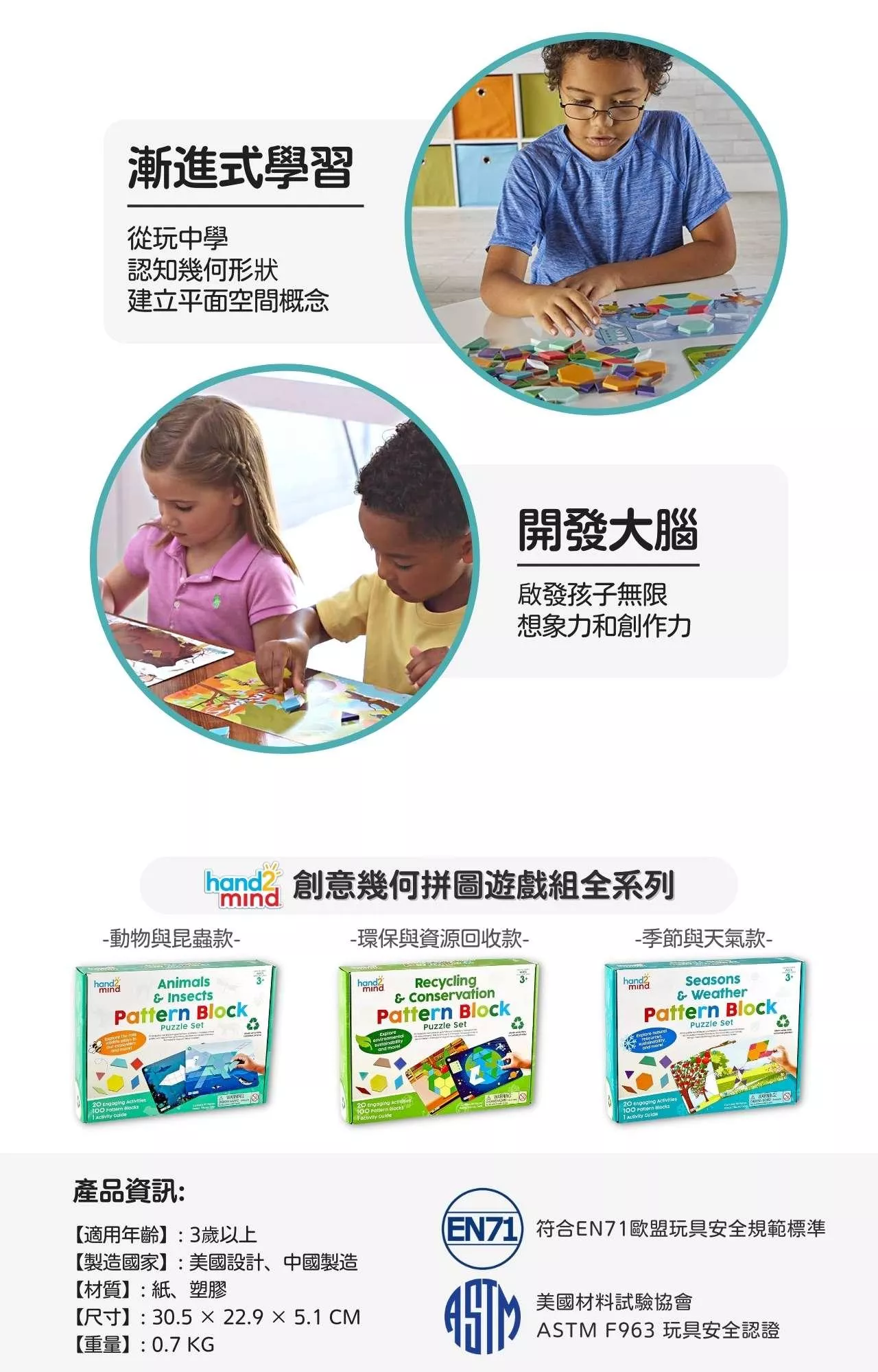 本遊戲組採用的環保幾何積木拼塊,除了可以用來操作、學習數學概念,配合聯合國「永續發展目標」SDGs 教育新趨勢,同時也是讓孩子們了解生物保育、永續發展概念的一組好工具。透過拼圖遊戲孩子們能夠從玩中學,訓練手眼協調,培養觀察、配對、排列、建構能力,並且啟發孩子的想像與創作力。內附的十張雙面拼圖遊戲卡片具有四個不同的挑戰級別,能夠伴隨著孩子的成長持續提供更高層級的學習課題,循序漸進提升孩子們對幾何和形狀關係間的思維能力。安全無毒,通過美國ASTM與歐盟EN71國際玩具安全認證。適用於3歲以上孩子的學齡前早期教育、數學啟蒙以及幼稚園、學校等教學場合。