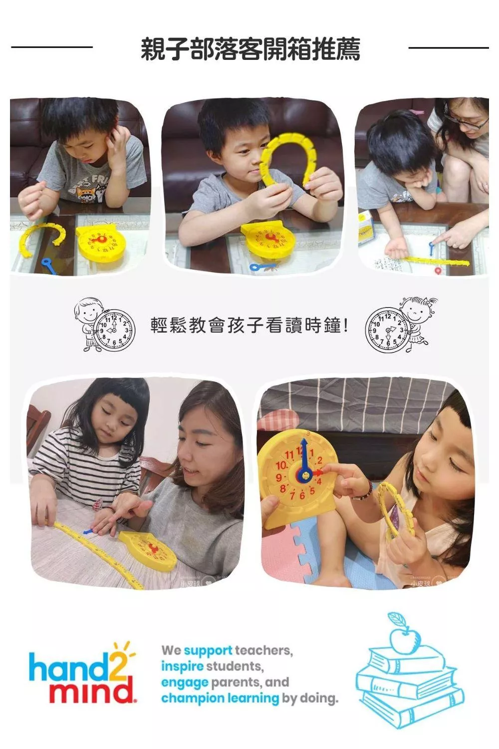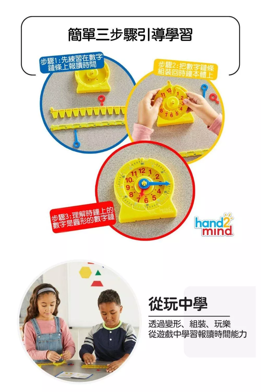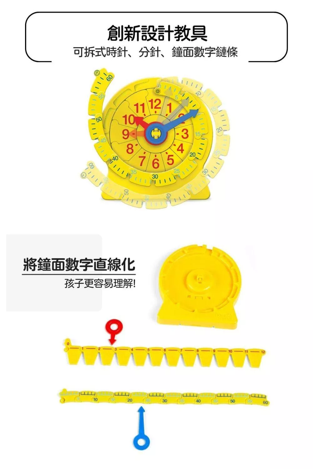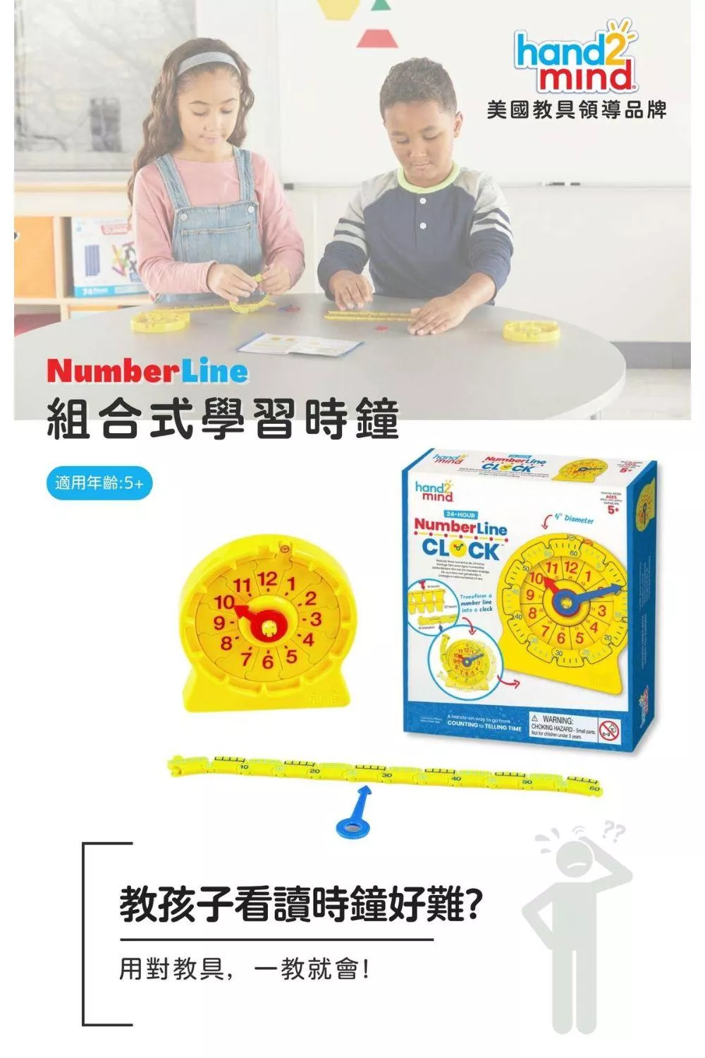 孩子學習看時鐘好難? 因為爸媽沒有用對教具! 來自美國知名教育品牌hand2mind推出的創新教具NumberLine組合式兒童學習時鐘,讓爸媽不用再傷透腦筋! NumberLine組合式學習時鐘由可以重複拆卸組裝的長針、短針,小時數字鏈以及分鐘數字鏈所構成,透過變形、組合遊戲的方式誘發孩子學習興趣,讓孩子愛上學習時鐘,同時更能了解時鐘的組成建構。透過創新的學習方式,小時、分鐘分開學才有效率! 讓孩子輕鬆學會看讀時鐘!