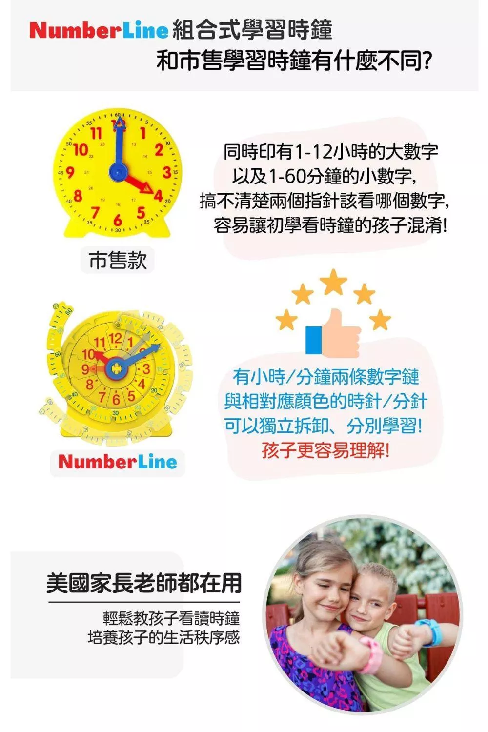 1. Numberline組合式學習時鐘跟市面上的學習時鐘有甚麼不同?
