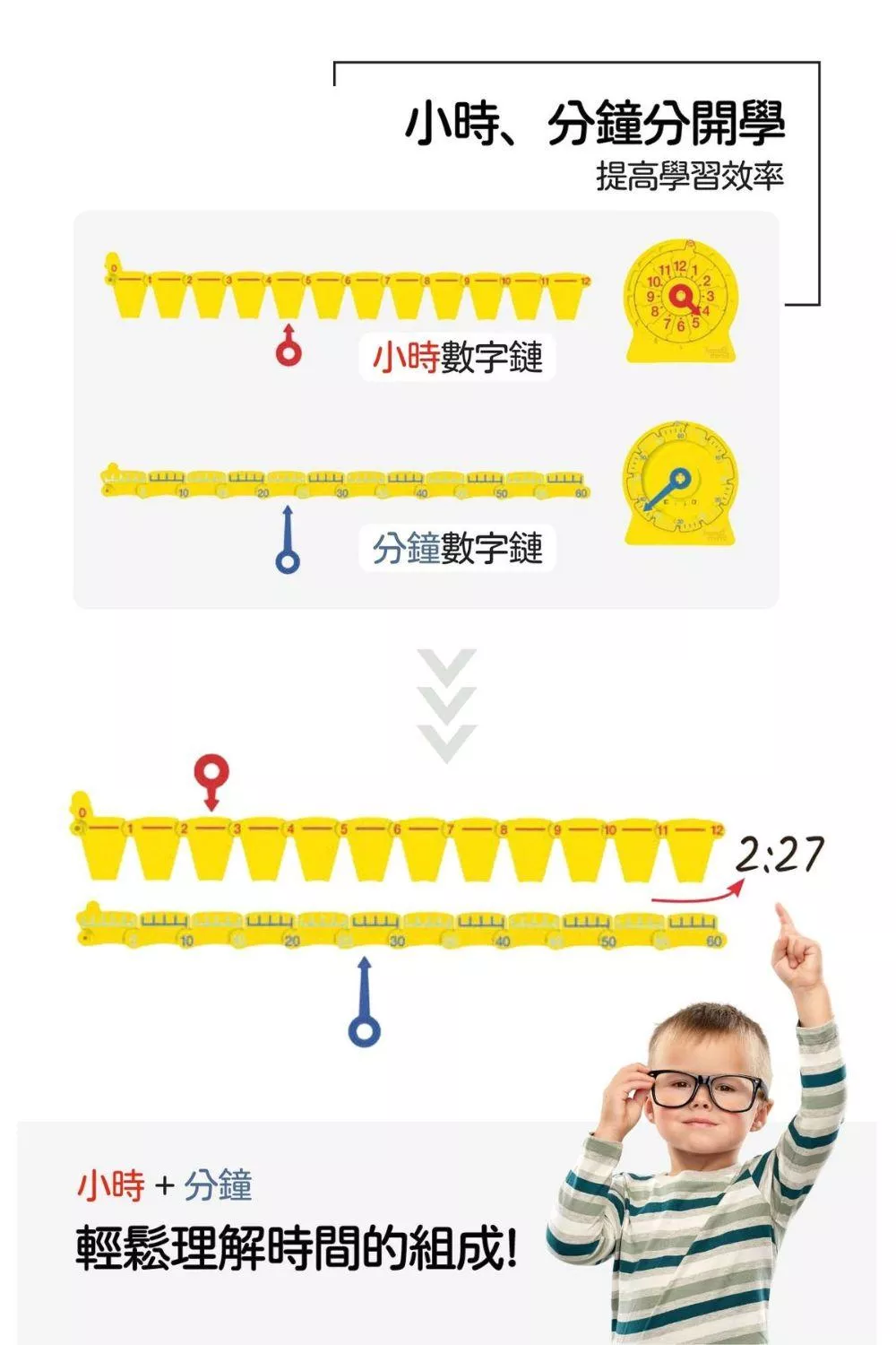 兒童在剛開始讀看時鐘的時候,由於時鐘上的數字同時顯示了單位是一的”小時”以及單位是五的”分鐘”,對於有些孩子來說認知有點困難。數字條鏈學習時鐘內包含”小時”以及”分鐘”兩條數字鏈,可以幫助孩子更容易理解時針與分針指在時鐘的數字上分別代表不同的單位。