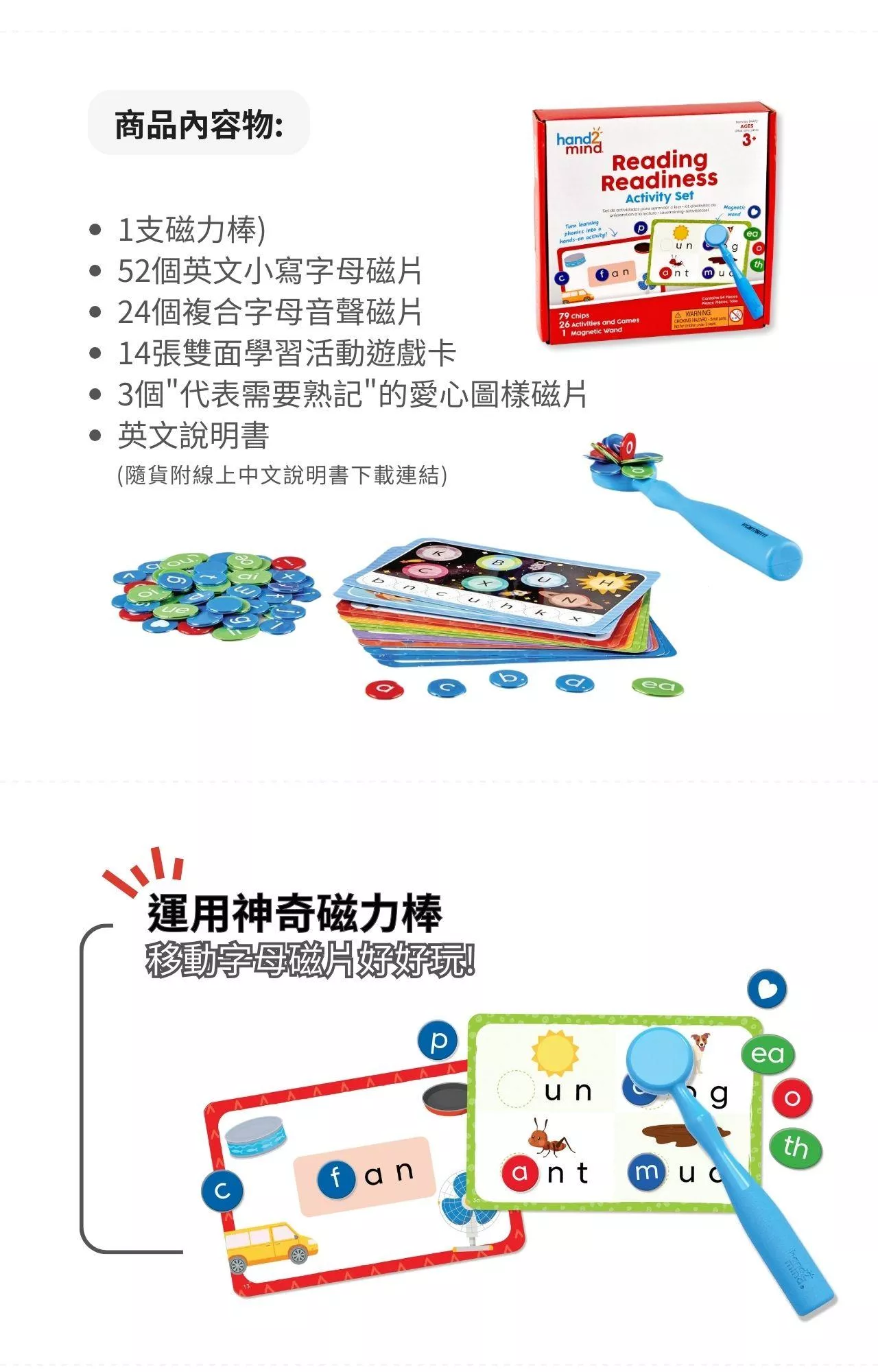 本學習組內含14張雙面學習遊戲卡 、79塊字母學習磁片和一支專為孩童小手設計的磁力棒。透過趣味的主題學習活動,當孩子們聽到並感受磁片被磁力棒吸附時發出令人興奮的「咔噠」聲時,能夠滿足孩子們的多重感官感受。 其中14張雙面學習遊戲卡,依照不同學習技能進行顏色分類和編號,可進行28種學習遊戲,涵蓋了從字母和發音,到拼讀與閱讀等各種主題。家長與老師們可以根據孩子的需求,使用這些學習遊戲卡來激發孩子們的學習興趣,培養孩子早期英語識字技能!