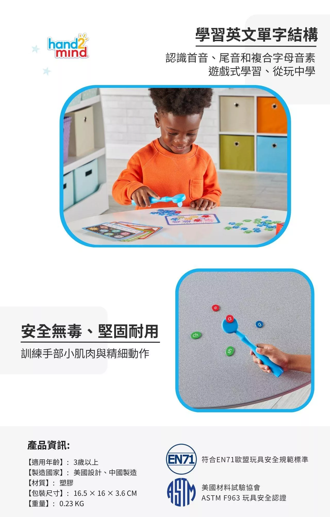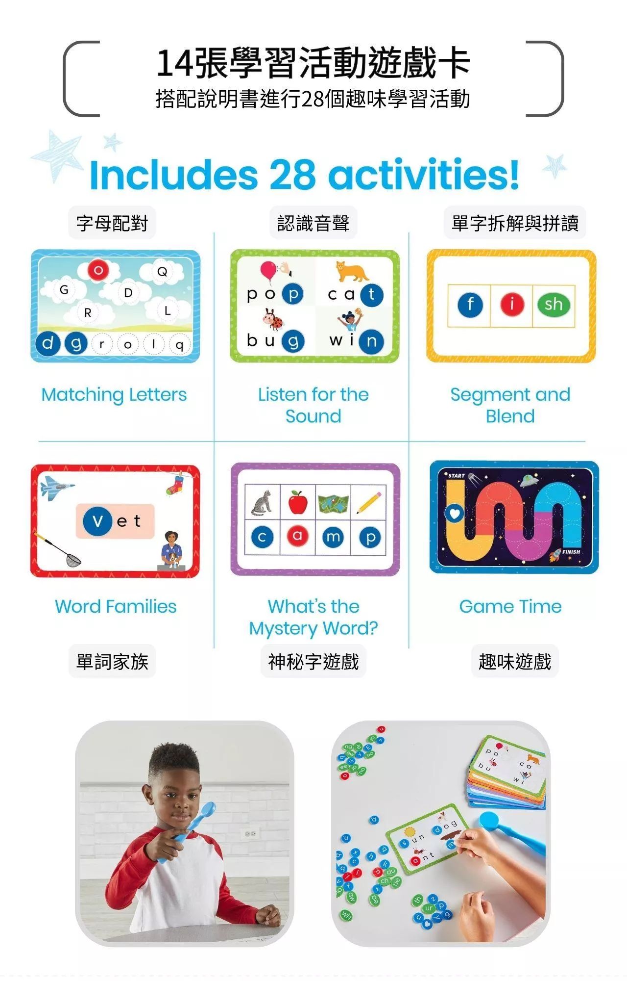 在這個學習寶盒中,孩子們可以使用磁力棒在遊戲卡上移動字母磁片,配合遊戲卡主題學習到包括像是大寫與小寫英文字母的配對、認識字母的音素、複合字母的音聲,以及常見的首音和尾音,並學習單字中音素的拼讀與分割,進一步建立起基礎單字例如CVC單字的組成結構概念。